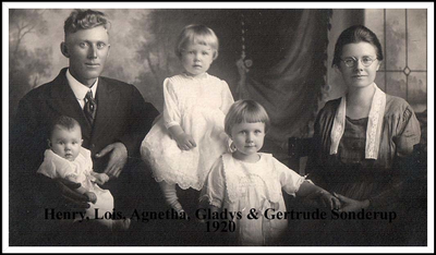Henry received his education in the rural schools and grew to manhood in the Wolbach area. He was united in marriage to Gurtie Pedersen in 1916 and to this union were born four daughters and a son. The couple farmed near Wolbach. Mrs. Sonderup died in 1924.